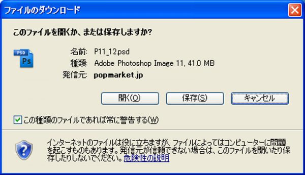 (2) DLをクリックすると 「ファイルのダウンロード」というポップアップウィンドウが表示されるので、「開く」または「保存」をクリックしてください。